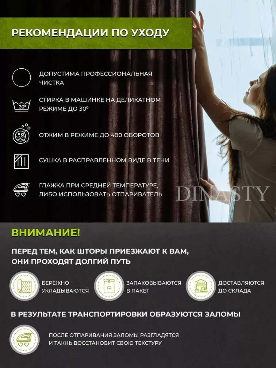 Рекомендации по уходу:— машинная стирка при температуре 30°С, или ручная стирка;— Глажка в режиме «Синтетика» с изнаночной стороны. Перед первым повесом обязательно прогладьте шторы.