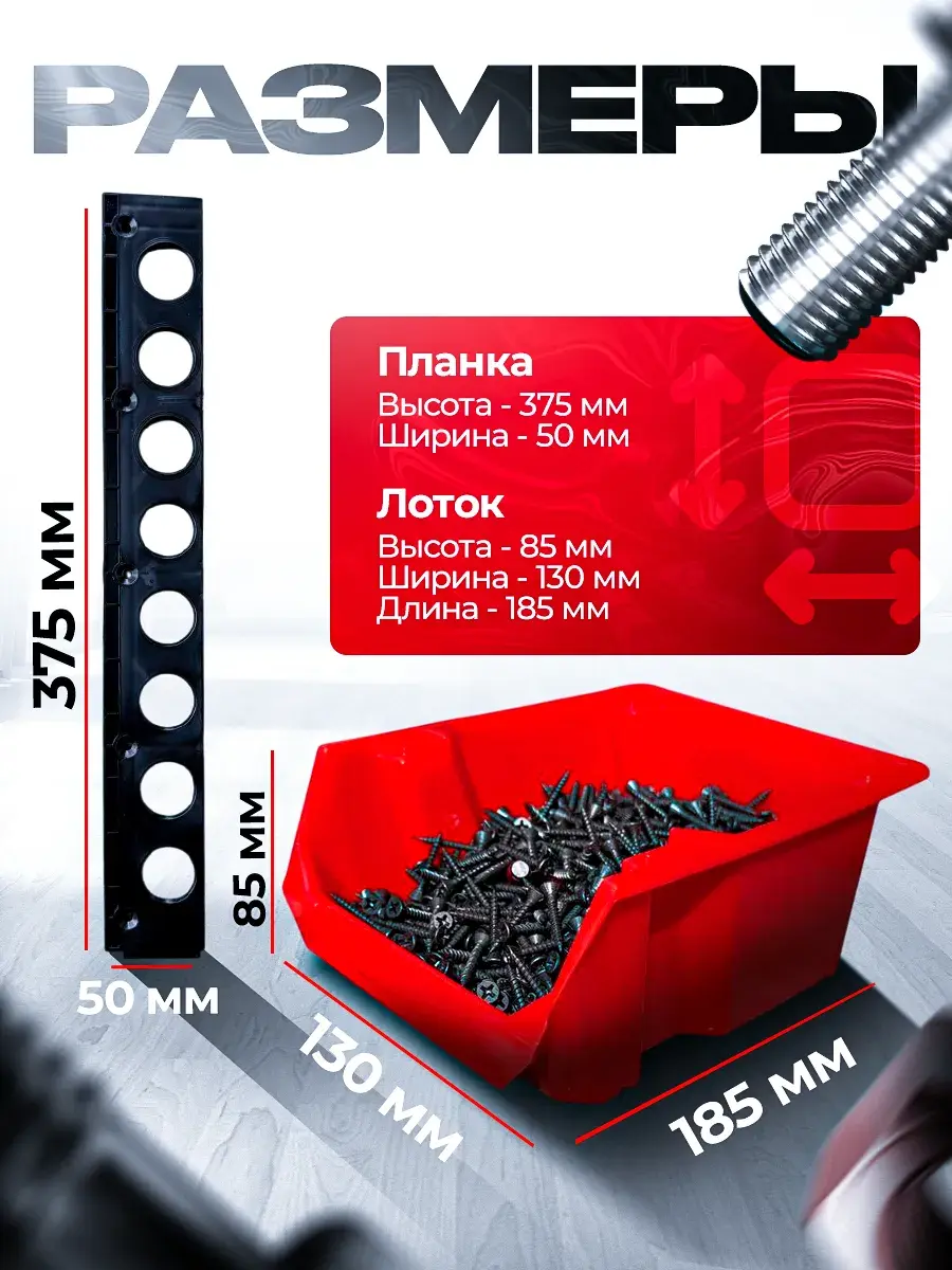 Лотки изготовлены из прочного полипропилена, что обеспечивает их долговечность и устойчивость к воздействию окружающей среды. Каждый лоток имеет высоту 8.5 см, длину 18.5 см и ширину 13 см, что позволяет разместить все необходимые метизы и инструменты в удобном месте.