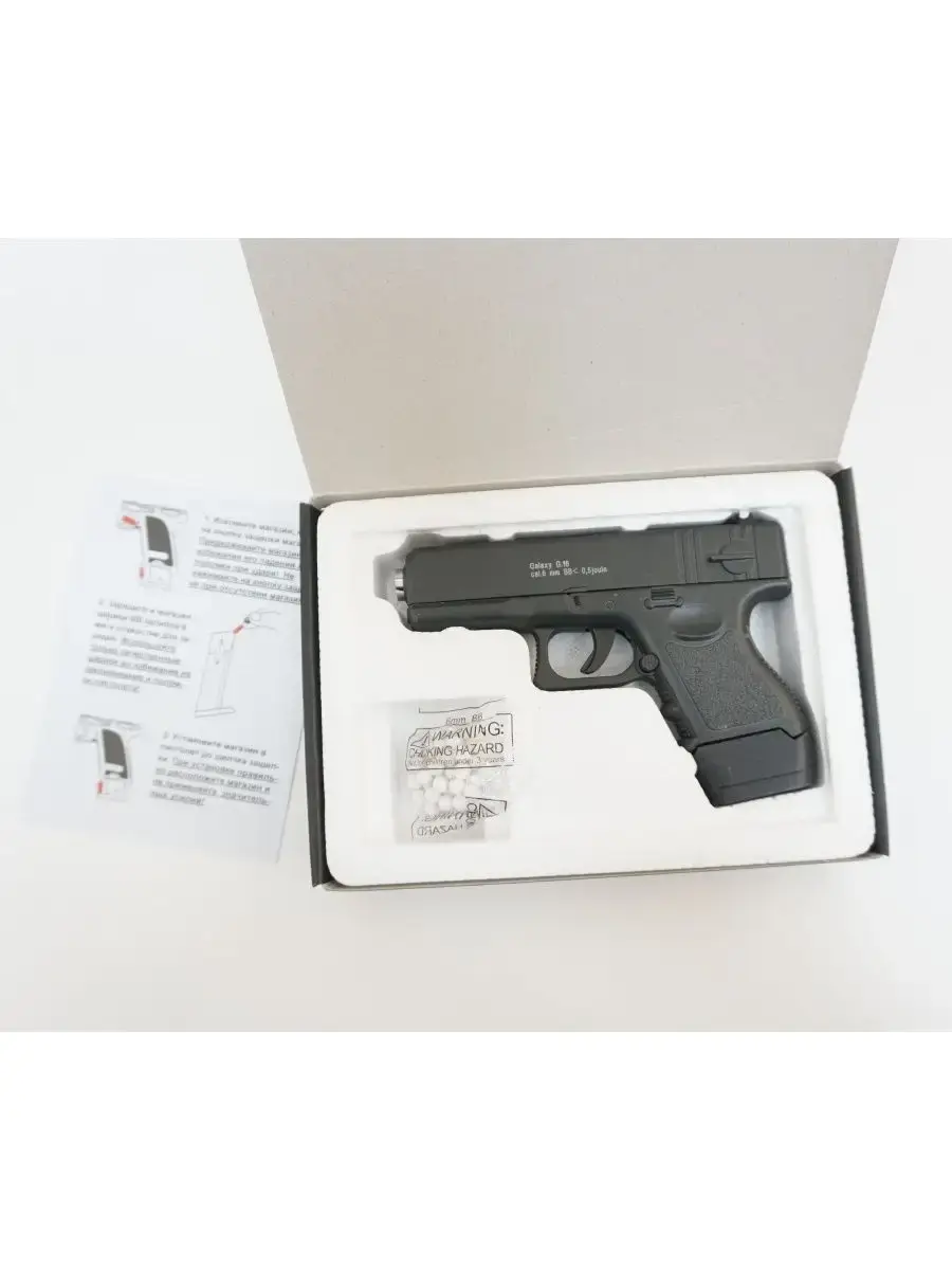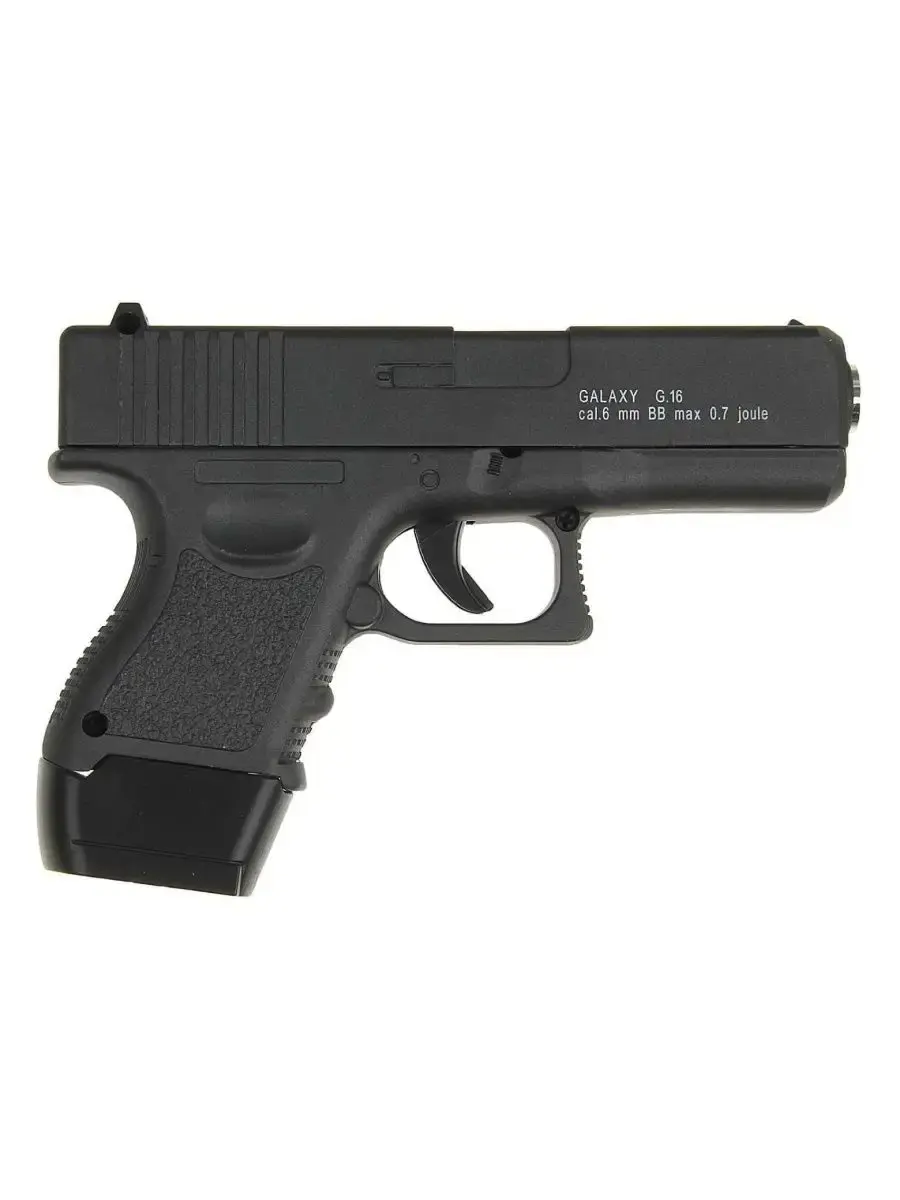 Пистолет Galaxy G.16 пружинный 6 мм - страйкбольная полноразмерная спринговая модель пистолета Glock. Страйкбольный пистолет выполнен в высоком качестве с использованием высокопрочных материалов. Стрельба из пистолета ведется шариками калибра 6 мм. Начальная скорость шарика составляет 45 м/с. Общая длина пистолета составляет 135 мм. Весит Пистолет Galaxy G.16 всего 290 гр.