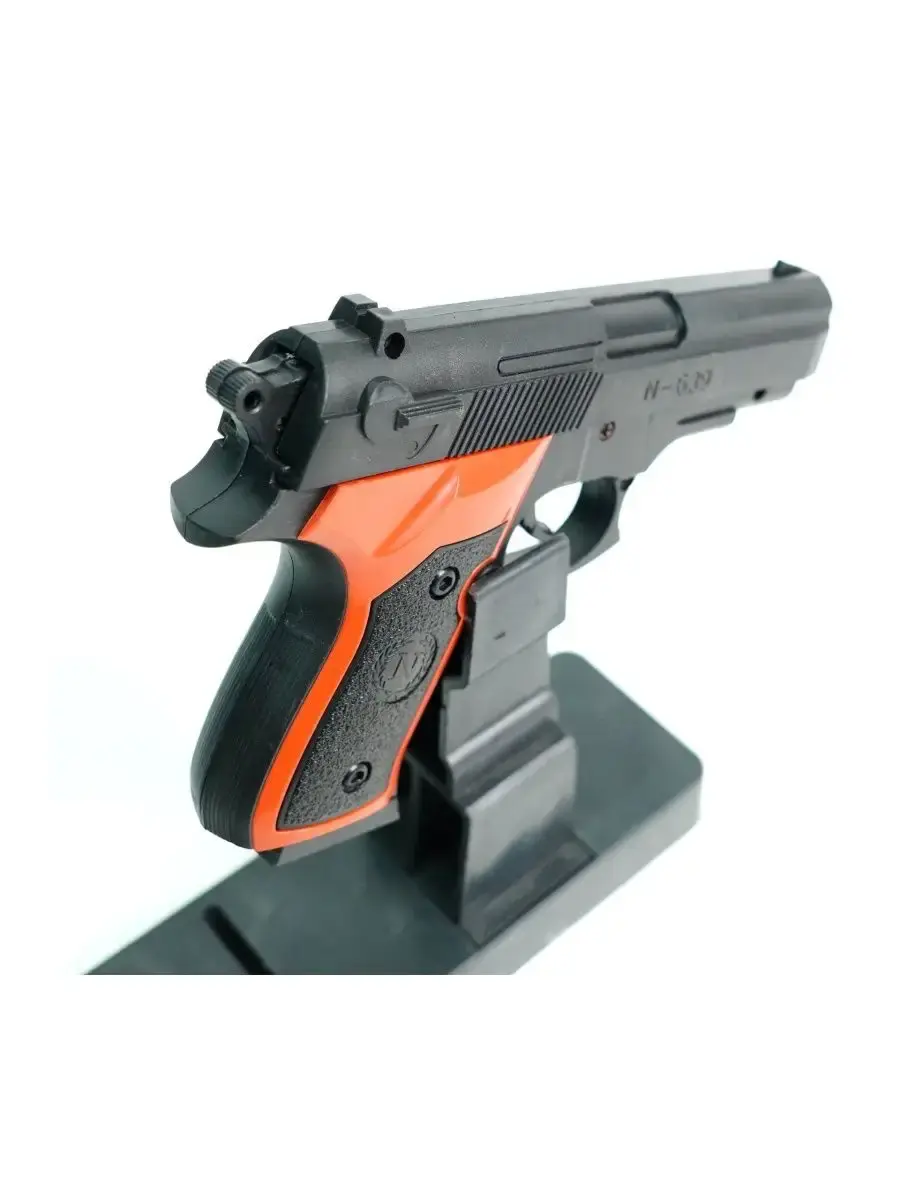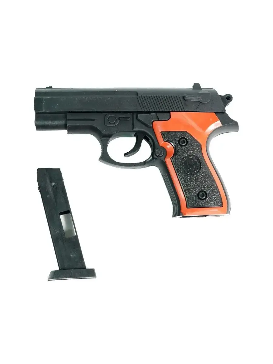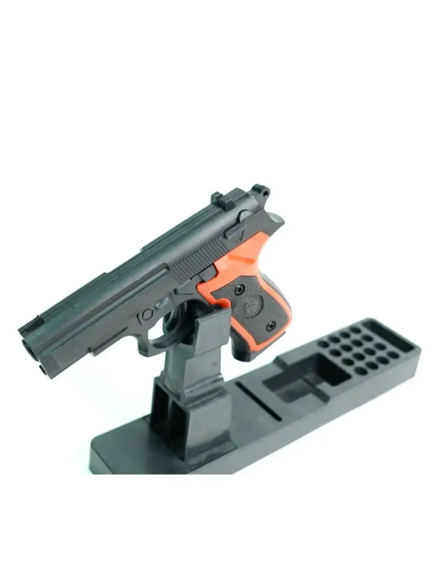 Пистолет Shantou B00833 Пружинный (спринговый) пистолет от фирмы Shantou, предназначенный для развлекательной стрельбы. Для выстрела необходимо предварительно взвести затвор, при этом сжимается боевая пружина. При нажатии на спусковой крючок пружина освобождается, и под ее действием соединенный с ней порешнь сжимает воздух в находящемся внутри цилиндре. За счет энергии этого сжатого воздуха шарик выталкивается из ствола. Для стрельбы из пистолета Шанту В00833 используются пластиковые шарики ВВ диаметром 6 мм. Все основные детали пистолета выполнены из пластика.
