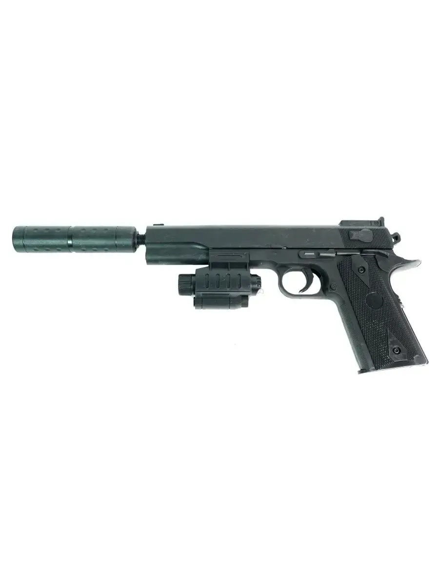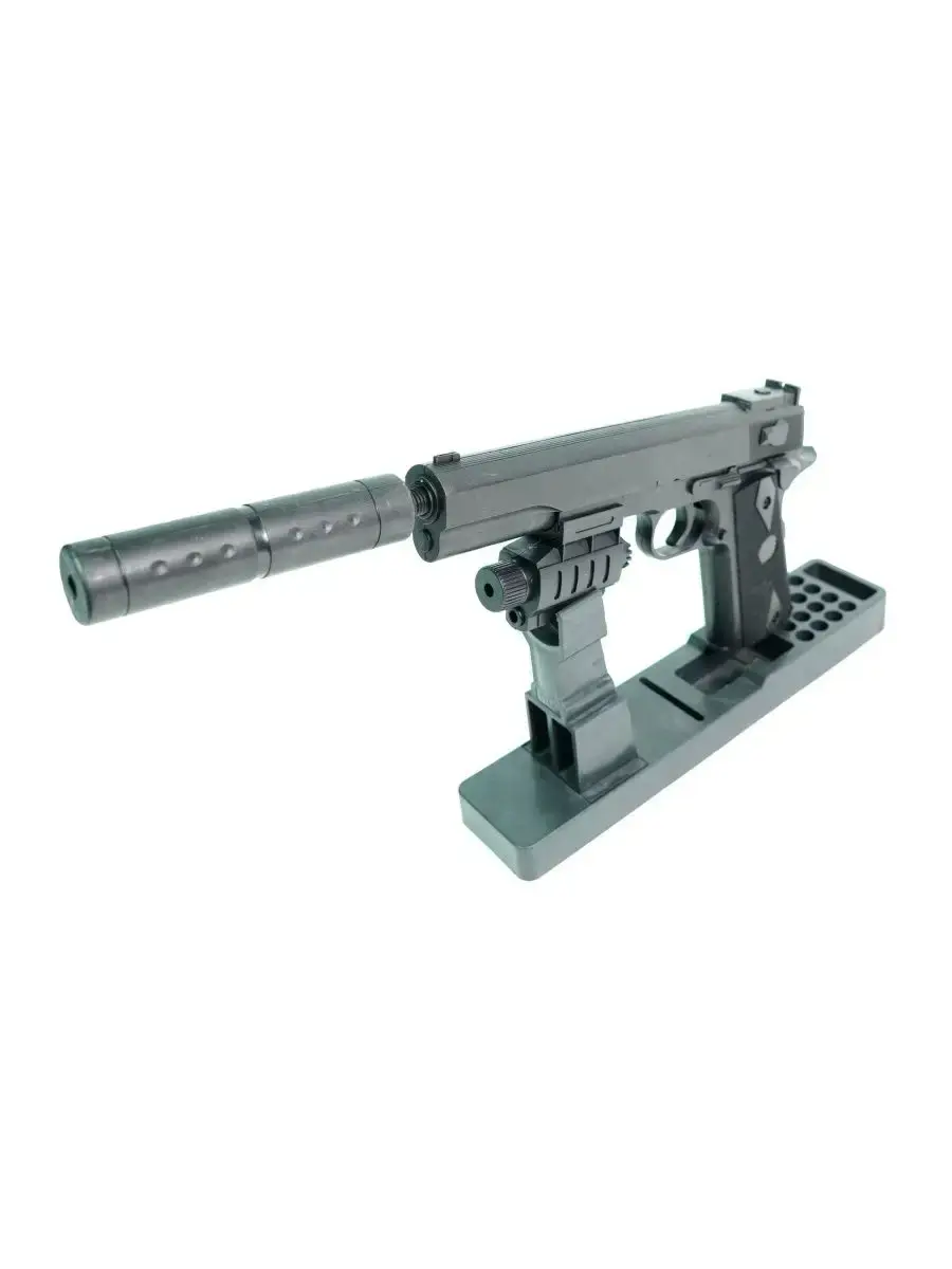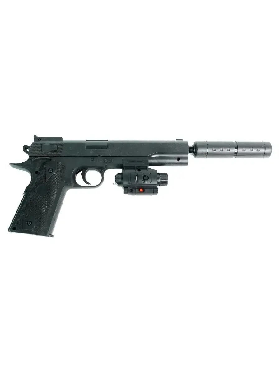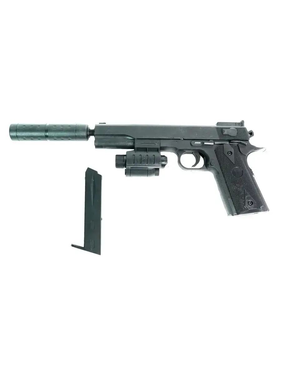 Пистолет Shantou B01409 Пружинный (спринговый) пистолет от китайской фирмы Shantou. Основное назначение пистолета - развлекательная стрельба. Для выстрела требуется предварительно взвести затвор, при этом сжимается боевая пружина. При нажатии на спусковой крючок пружина освобождается, и под ее действием соединенный с ней порешнь сжимает воздух в находящемся внутри цилиндре, после чего давление этого сжатого воздуха выталкивает шарик из ствола. Для стрельбы из пистолета Шанту В01409 используются пластиковые шарики ВВ диаметром 6 мм. Все основные детали пистолета выполнены из пластика. В предлагаемом варианте пистолет комплектуется лазерным целеуказателем (ЛЦУ) и муляжом глушителя.