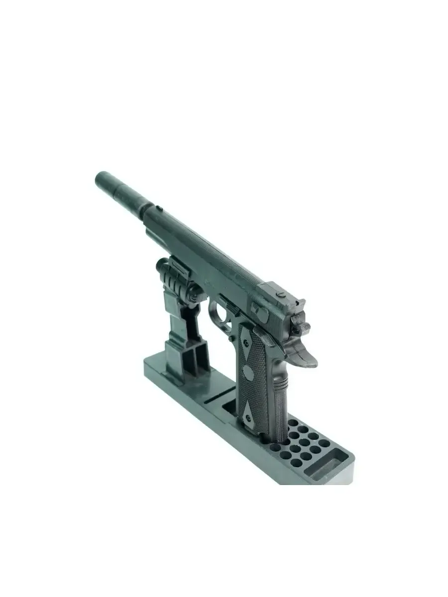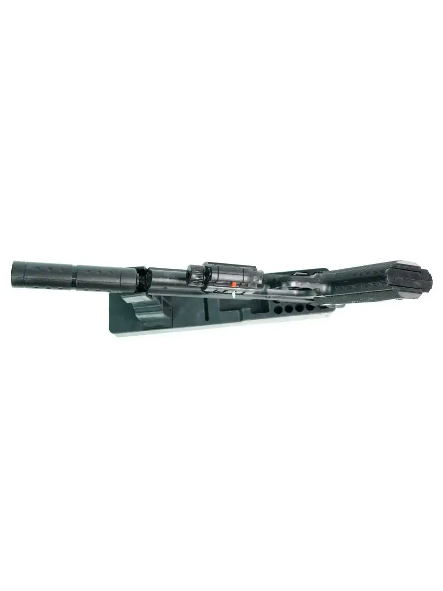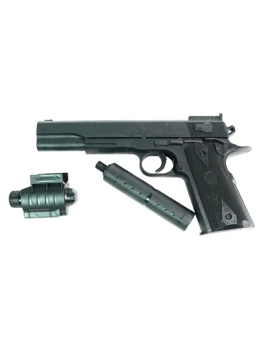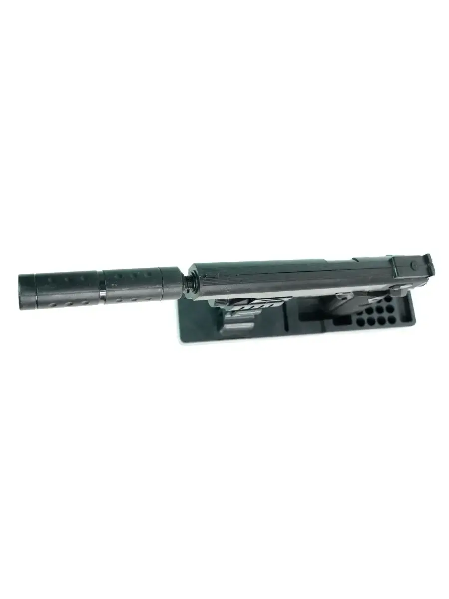 Пистолет Shantou B01409 Пружинный (спринговый) пистолет от китайской фирмы Shantou. Основное назначение пистолета - развлекательная стрельба. Для выстрела требуется предварительно взвести затвор, при этом сжимается боевая пружина. При нажатии на спусковой крючок пружина освобождается, и под ее действием соединенный с ней порешнь сжимает воздух в находящемся внутри цилиндре, после чего давление этого сжатого воздуха выталкивает шарик из ствола. Для стрельбы из пистолета Шанту В01409 используются пластиковые шарики ВВ диаметром 6 мм. Все основные детали пистолета выполнены из пластика. В предлагаемом варианте пистолет комплектуется лазерным целеуказателем (ЛЦУ) и муляжом глушителя.