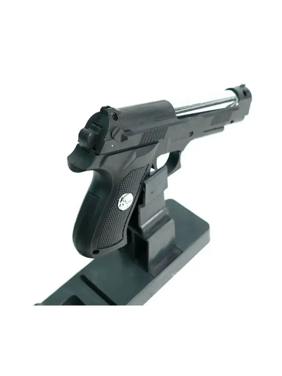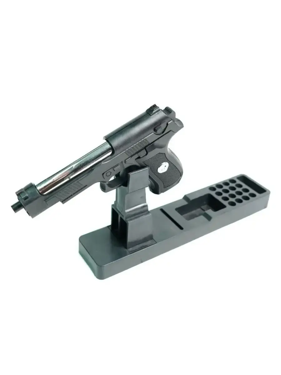 Пистолет Shantou B01584 Пружинный (спринговый) пистолет от фирмы Shantou. Для выстрела необходимо предварительно взвести затвор, при этом сжимается боевая пружина. При нажатии на спусковой крючок пружина освобождается, и под ее действием соединенный с ней порешнь сжимает воздух в находящемся внутри цилиндре. Под действием этого сжатого воздуха шарик выталкивается из ствола. Для стрельбы из пистолета Шанту В01584 используются пластиковые шарики ВВ диаметром 6 мм. Все основные детали пистолета выполнены из пластика.