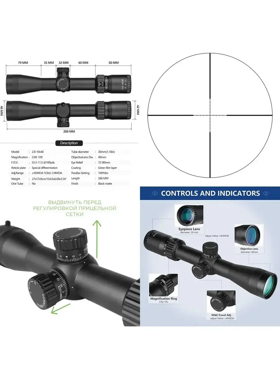 Поле зрения (F.O.V.):10м при увеличении 2,8Х и 3,5 м при кратности 10Х. Поле зрения - максимальное линейное расстояние по горизонтали, которое можно увидеть сквозь прицел на удалении в 100м от него.