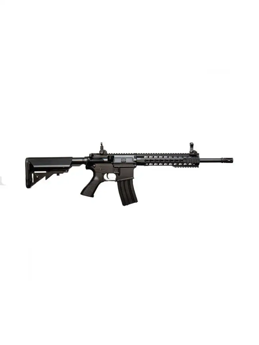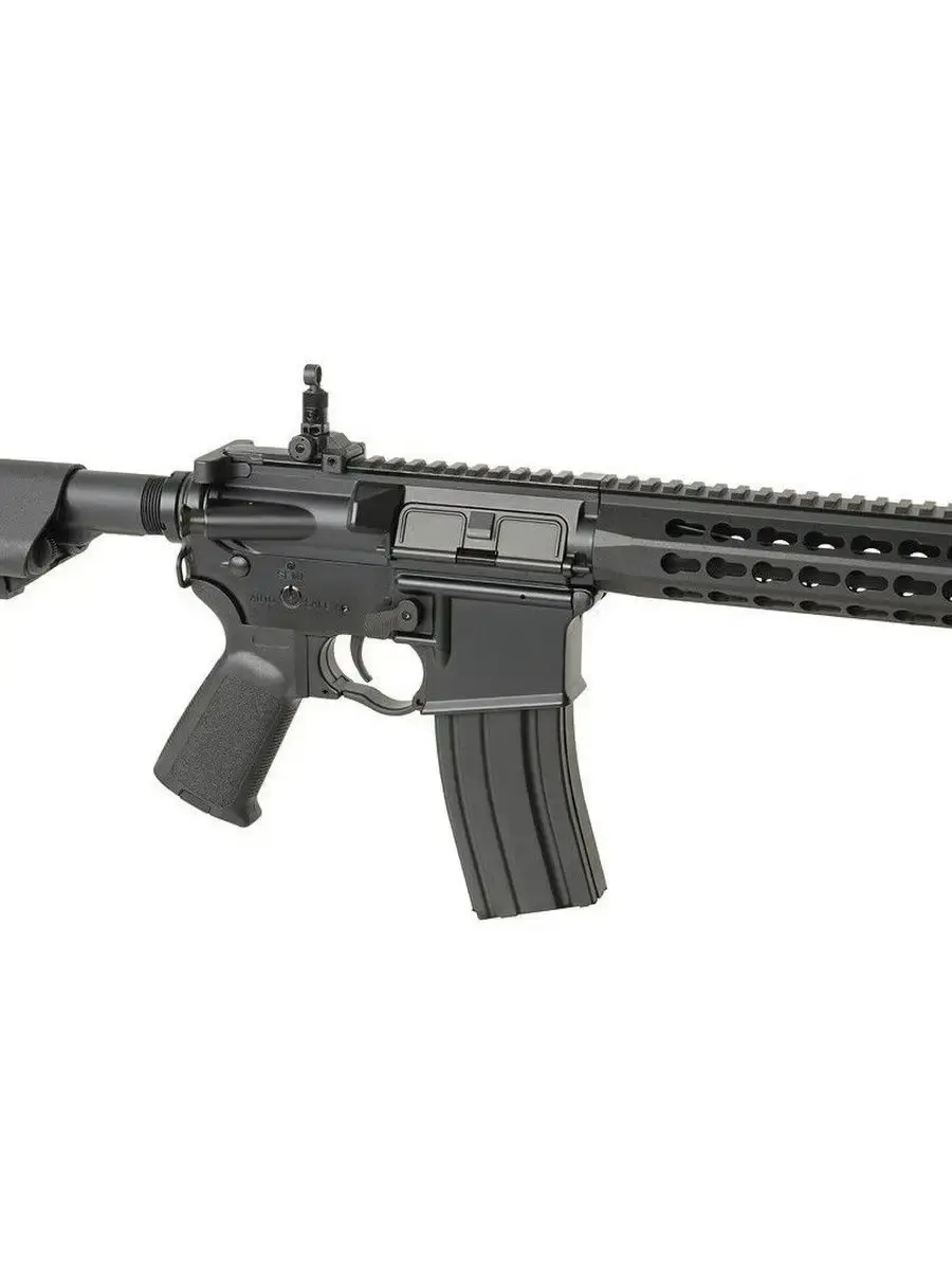 Бюджетная версия страйкбольного автомата M4A1 с Keymod цевьем. Это недорогой вариант для тех, кто только начинает играть в страйкбол, либо для подарка ребенку. Материалы изготовления: Корпус автомата полностью выполнен из пластика. Металлические части: гирбокс, внешний и внутренний стволики, крепежные винты. За счет преобладания пластика в материалах вес привода (без аккумулятора) составляет всего 1,8 кг. Тактико-технические характеристики (ТТХ): Скорость вылета 0,20 шара составляет ~125 м/с. Длинный ствол позволяет вести прицельный огонь на расстоянии около 30 метров. Переключатель огня, как и на боевом аналоге, имеет 3 положения: предохранитель, одиночный выстрел, автомат. Внутри установлен стандартный гирбокс 2 версии от CYMA, хоп-ап регулируемый. Телескопический приклад типа Crane Stock имеет 6 позиций длины. Общая длина модели равна 876 мм, а со сложенным прикладом – 792 мм. Иные характеристики: Текстурированная пистолетная рукоять позволяет лучше контролировать автомат. По верхней грани корпуса и цевья идет длинная RIS-планка (рельса). Кроме того, на боковых и нижней гранях цевья также установлены RIS-планки, на которые можно при желании установить прицел, фонарь, ЛЦУ или тактическую рукоять. Мушка и целик складные. Комплектация: Страйкбольный автомат Cyma CM515 M4 Keymod; Пластиковый бункерный магазин на 300 шаров; Аккумулятор CQB-типа, напряжение 8.4V, ёмкость 1100 mAh. Устанавливается в приклад. Тип коннектора - Мини-тамия; Зарядное устройство; Шомпол.