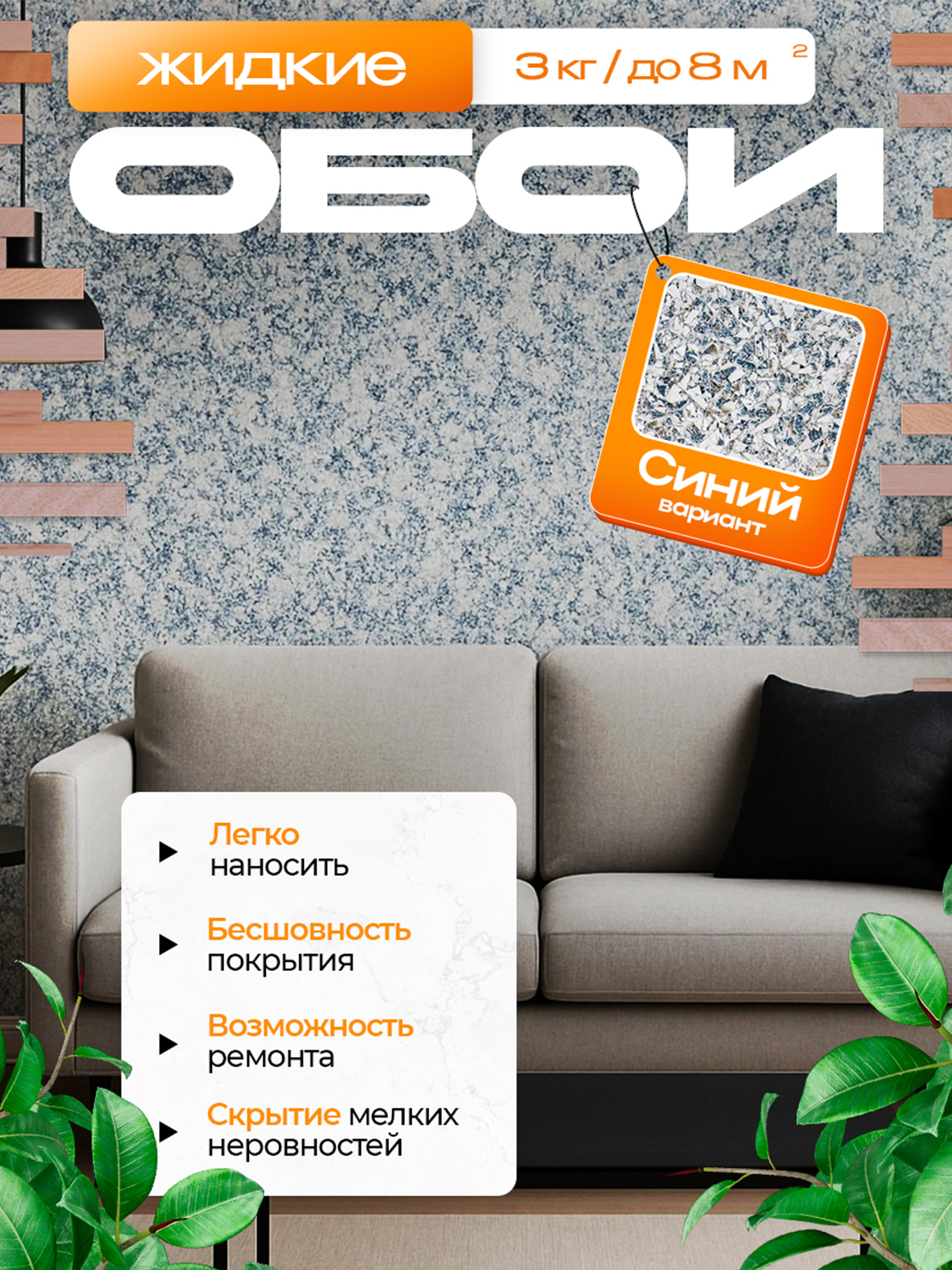 ЖИДКИЕ ОБОИ — СВОБОДА ДЛЯ ВАШЕЙ ФАНТАЗИИ!РЕМОНТОПРИГОДНОСТЬ. Поврежденный участок легко замазывается свежей смесью не оставляя следов ремонта.ЭКОНОМИЯ НА ПЕРВИЧНОЙ ОТДЕЛКЕ. Жидкие обои не нуждаются в предварительной подготовке стен, что позволяет снизить цену ремонтных работ.ВЫСОКОЕ ШУМОПОГЛОЩЕНИЕ. Жидкие обои, благодаря своей пористой структуре, способны поглощать шумы.МНОГООБРАЗИЕ ЦВЕТОВЫХ И ДЕКОРАТИВНЫХ РЕШЕНИЙ. Жидкие обои покрываются красками от спокойных пастельных и офисносдержанных до ярких и сочных.ЭТО ПРОСТО!ЗАЛИТЬ 3 л воды на 1 кг сухого продукта.ПЕРЕМЕШАТЬ Вручную, процеживая смесь между пальцами для полного перемешивания без сгустков.НАСТОЯТЬ Дать отстояться 12 часов и перемешать повторно. Готовая смесь хранится до 3-х недель в герметично закупоренной таре.НАНЕСТИ Готовая смесь наносится небольшими порциями равномерным тонким слоем.ЭТО ЭКОЛОГИЧНО!ЭКОЛОГИЧЕСКИ ЧИСТЫЙ ПРОДУКТ . Созданы на основе целлюлозы.ГИПОАЛЛЕРГЕННО .Не содержит вредных добавок.БЕЗОПАСНО Можно использовать в помещениях с детьми и домашними животными.РЕКОМЕНДАЦИИ: Перед началом работы, необходимо все пачки смешать в сухом виде, чтобы не было разнотона.Если Вы обнаружили в пачке комки клея, их нужно растереть руками, перед тем как залить водой, для того чтобы клей лучше растворялся.ВНИМАНИЕ! Каждая партия обоев, может отличаться друг от друга оттенком. Поэтому, если вдруг Вам не хватило жидких обоев, свяжитесь с нами, чтобы мы смогли отправить Вам нужную партию.ПРИМЕЧАНИЕ: Оттенок может отличаться от картинки.