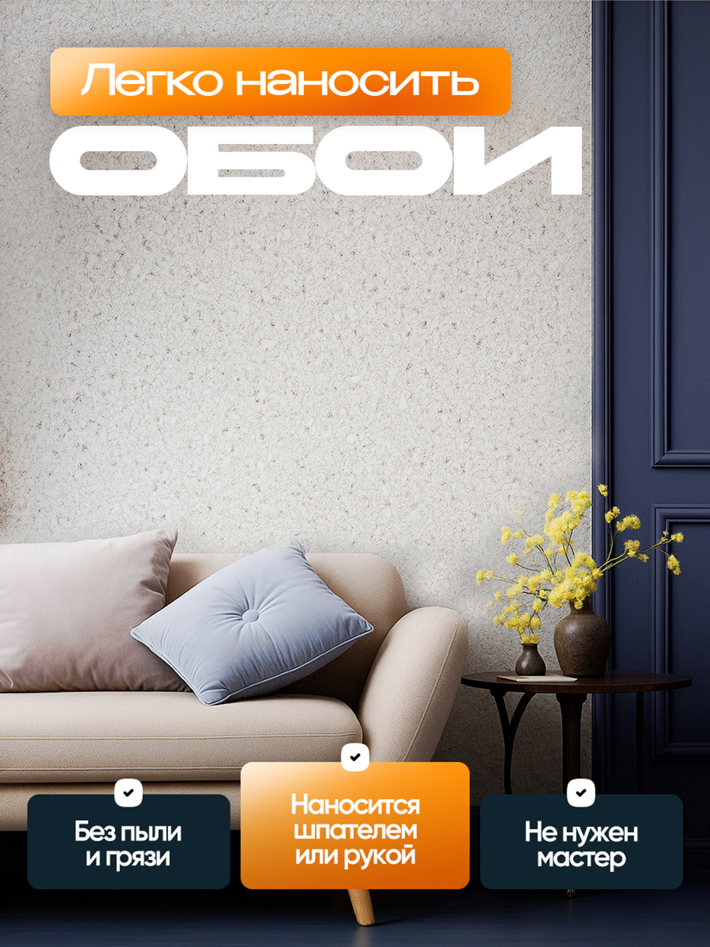 ЖИДКИЕ ОБОИ — СВОБОДА ДЛЯ ВАШЕЙ ФАНТАЗИИ!РЕМОНТОПРИГОДНОСТЬ. Поврежденный участок легко замазывается свежей смесью не оставляя следов ремонта.ЭКОНОМИЯ НА ПЕРВИЧНОЙ ОТДЕЛКЕ. Жидкие обои не нуждаются в предварительной подготовке стен, что позволяет снизить цену ремонтных работ.ВЫСОКОЕ ШУМОПОГЛОЩЕНИЕ. Жидкие обои, благодаря своей пористой структуре, способны поглощать шумы.МНОГООБРАЗИЕ ЦВЕТОВЫХ И ДЕКОРАТИВНЫХ РЕШЕНИЙ. Жидкие обои покрываются красками от спокойных пастельных и офисносдержанных до ярких и сочных.ЭТО ПРОСТО!ЗАЛИТЬ 3 л воды на 1 кг сухого продукта.ПЕРЕМЕШАТЬ Вручную, процеживая смесь между пальцами для полного перемешивания без сгустков.НАСТОЯТЬ Дать отстояться 12 часов и перемешать повторно. Готовая смесь хранится до 3-х недель в герметично закупоренной таре.НАНЕСТИ Готовая смесь наносится небольшими порциями равномерным тонким слоем.ЭТО ЭКОЛОГИЧНО!ЭКОЛОГИЧЕСКИ ЧИСТЫЙ ПРОДУКТ . Созданы на основе целлюлозы.ГИПОАЛЛЕРГЕННО .Не содержит вредных добавок.БЕЗОПАСНО Можно использовать в помещениях с детьми и домашними животными.РЕКОМЕНДАЦИИ: Перед началом работы, необходимо все пачки смешать в сухом виде, чтобы не было разнотона.Если Вы обнаружили в пачке комки клея, их нужно растереть руками, перед тем как залить водой, для того чтобы клей лучше растворялся.ВНИМАНИЕ! Каждая партия обоев, может отличаться друг от друга оттенком. Поэтому, если вдруг Вам не хватило жидких обоев, свяжитесь с нами, чтобы мы смогли отправить Вам нужную партию.ПРИМЕЧАНИЕ: Оттенок может отличаться от картинки.
